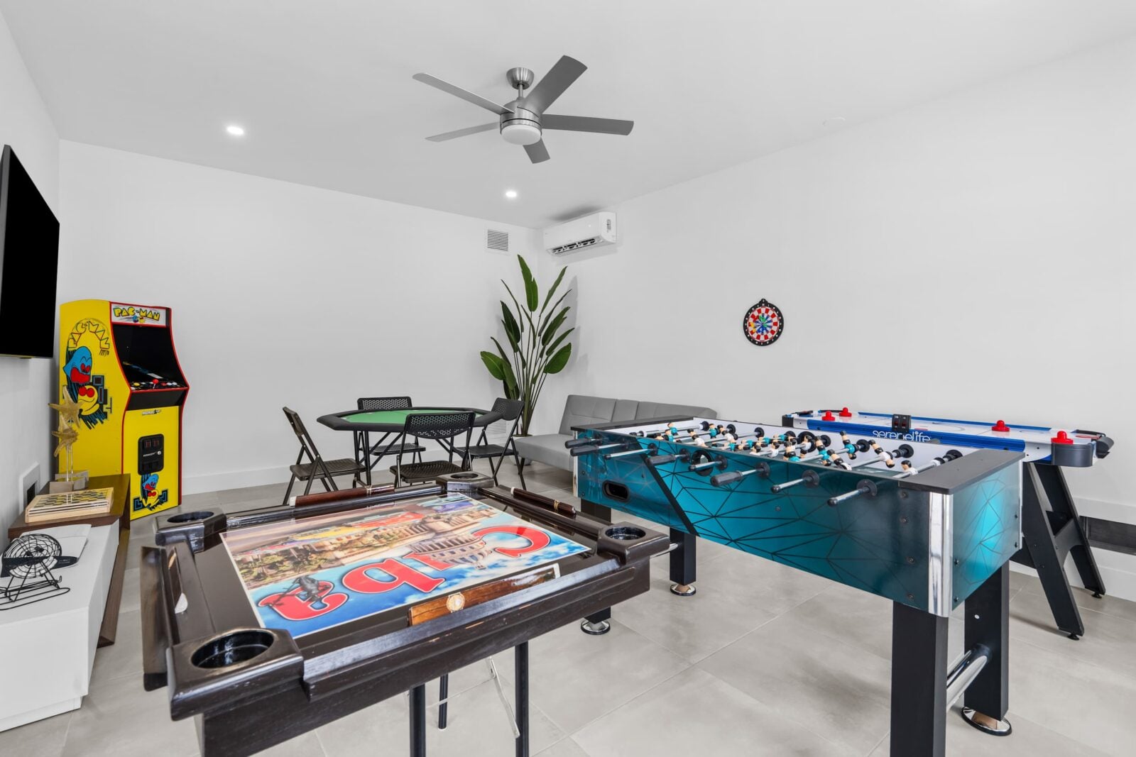 The game room is a standout feature, offering hours of entertainment with foosball, air hockey, an arcade machine, board games, and more, perfect for families or groups looking for fun beyond the beach!