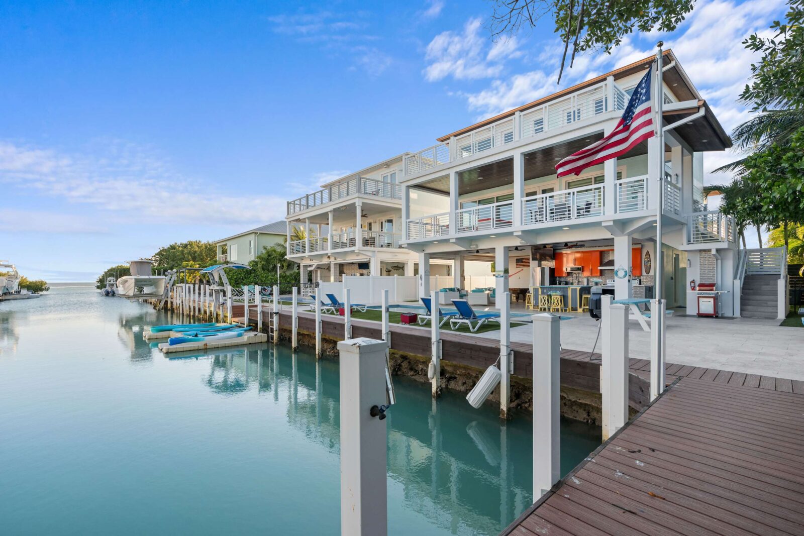 Both floors feature spacious terraces/porches from where you can gaze at the breathtaking sea views. The ground floor is the cherry on top of the cake, as it features a plethora of relaxing and entertaining amenities, including a large heated swimming pool, an outdoor kitchen, and a boat slip.