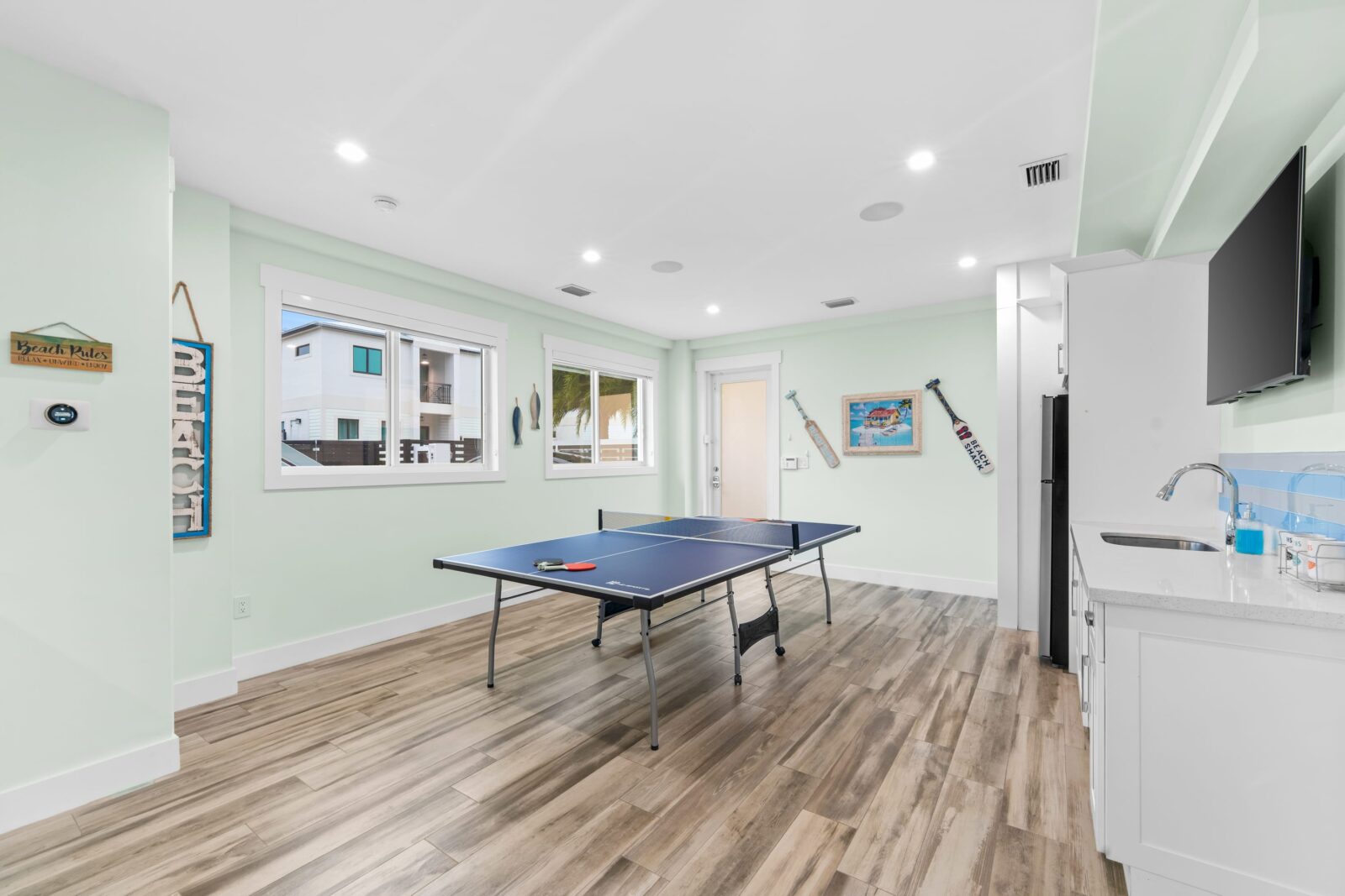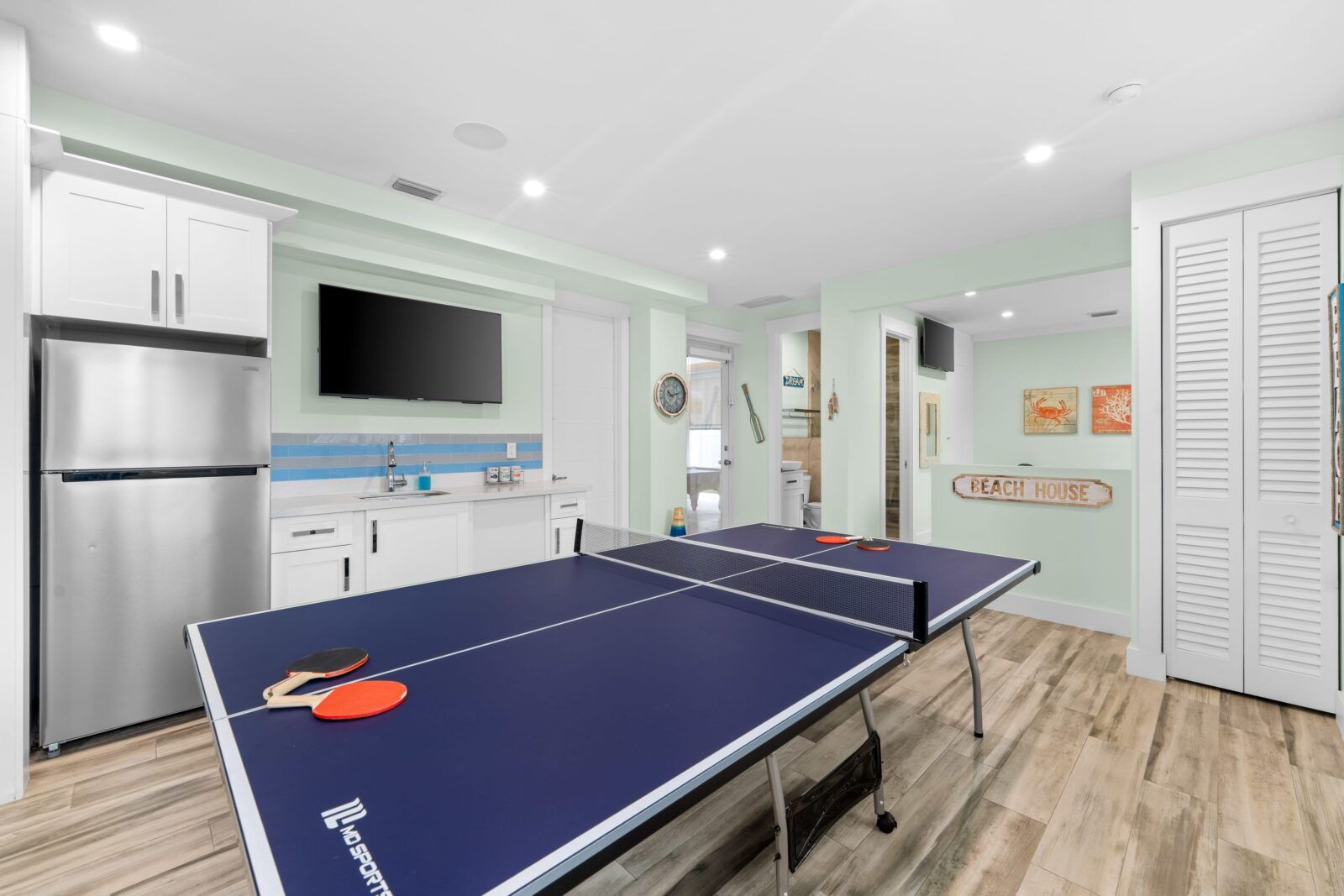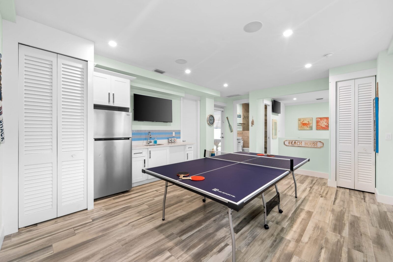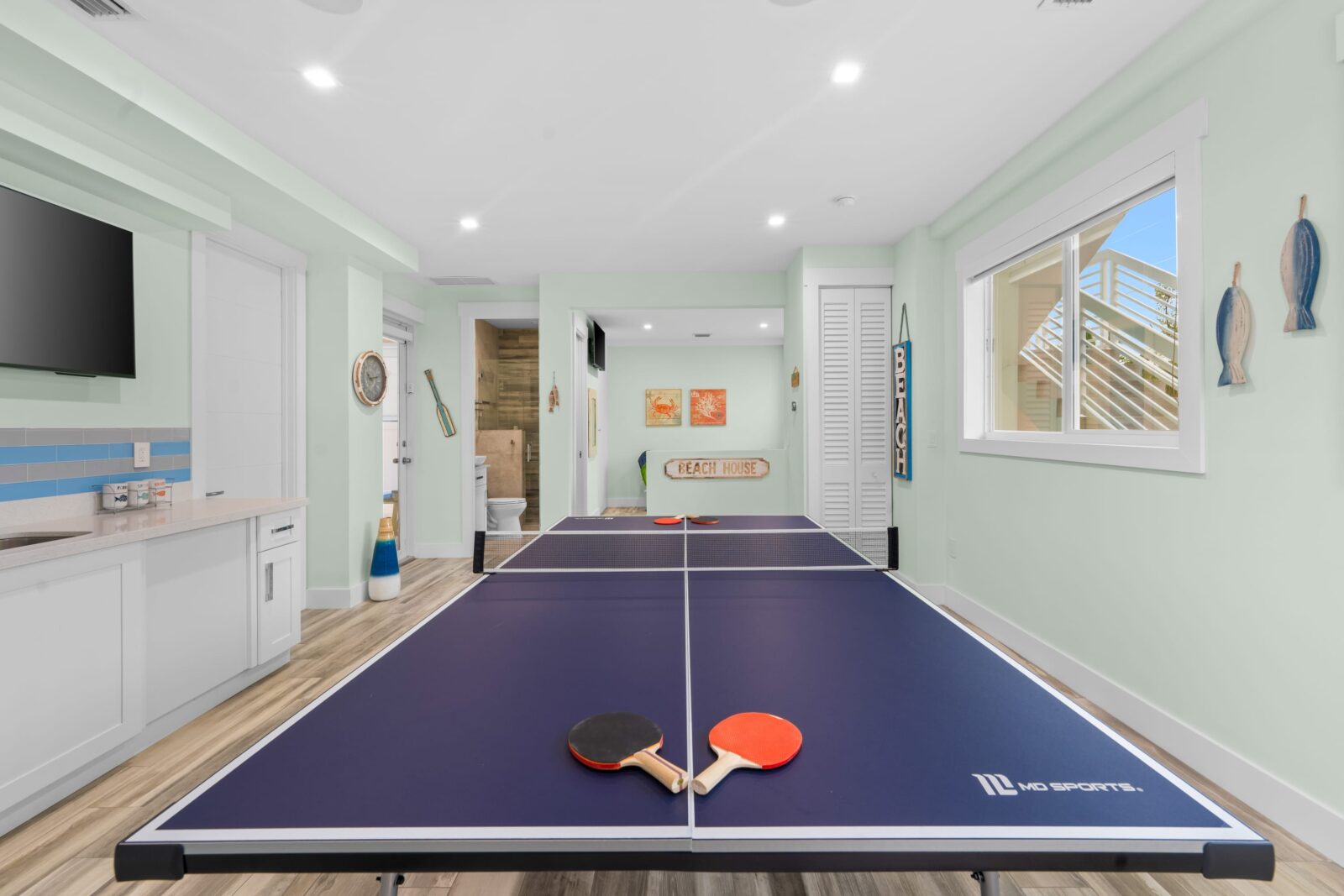 Descending to the bottom floor, you'll find the ultimate entertainment haven. The spacious game room boasts a ping pong table where epic matches unfold, accompanied by a large-screen TV for catching the big game or streaming your favorite shows and movies. No need to interrupt the fun for restroom breaks, as there's a convenient bathroom right within the game room.