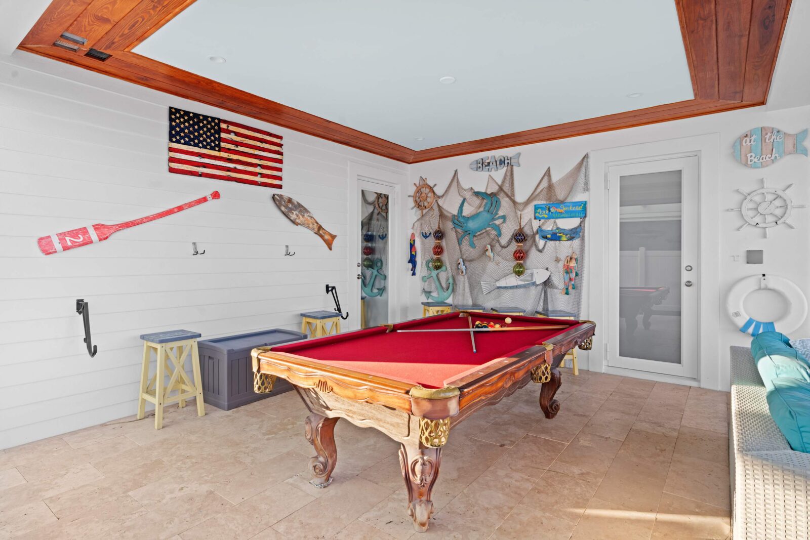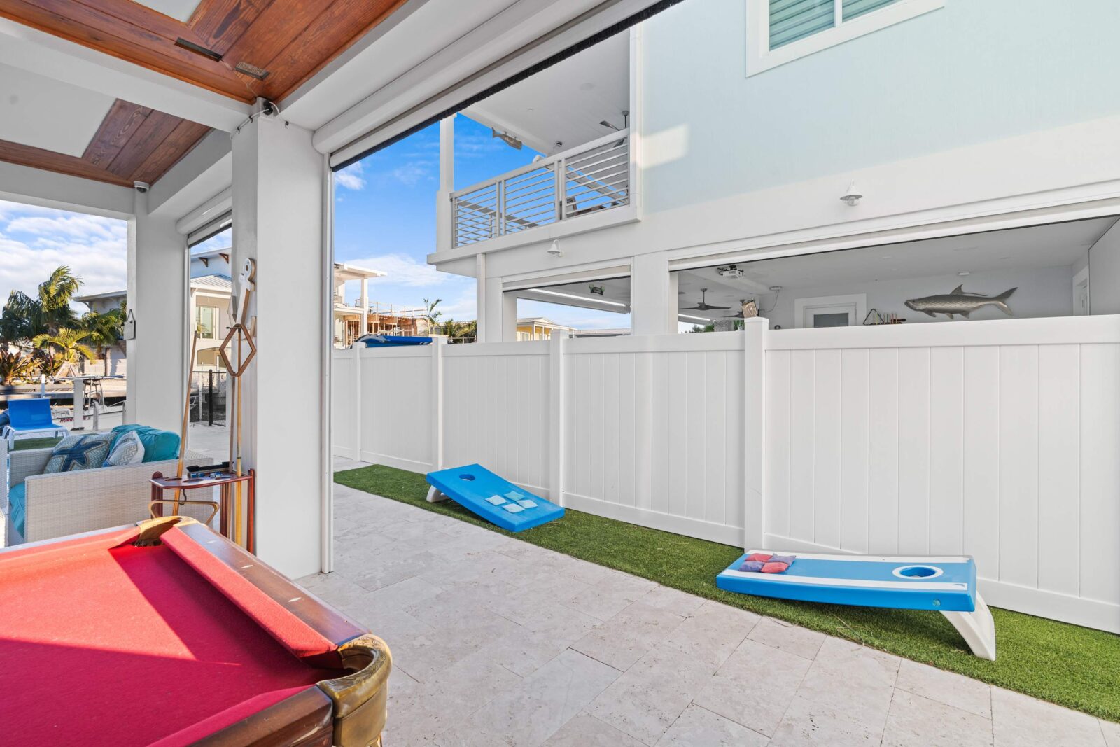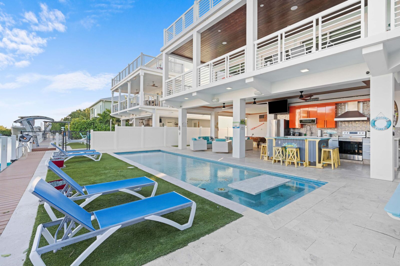 Last but certainly not least is the lavish ground floor with the large swimming pool, ocean access, kitchen and bar, and many games that will entertain you for hours. It has its own dock with 50 feet of space. The heated pool has its own private spa, so you can stay close to home if you wish. Outside security cameras and a separate AC unit on each floor add to the comfort and convenience of this property.