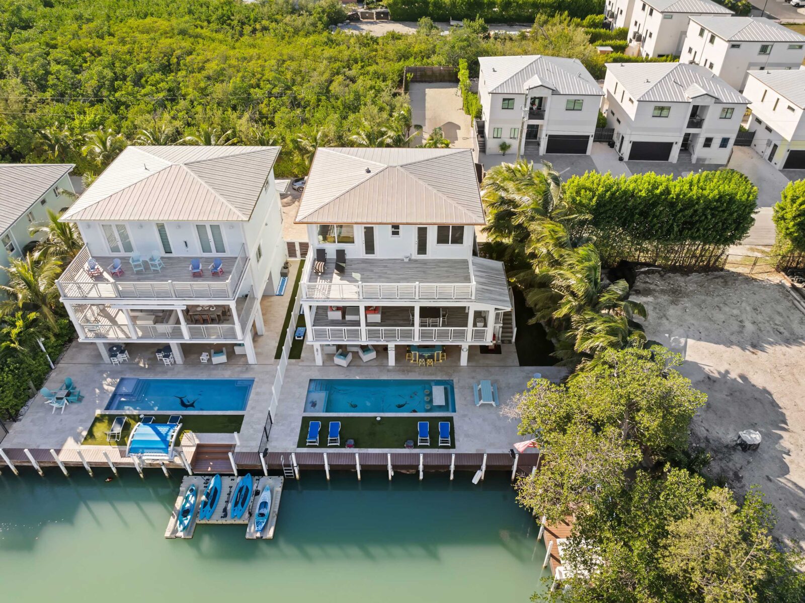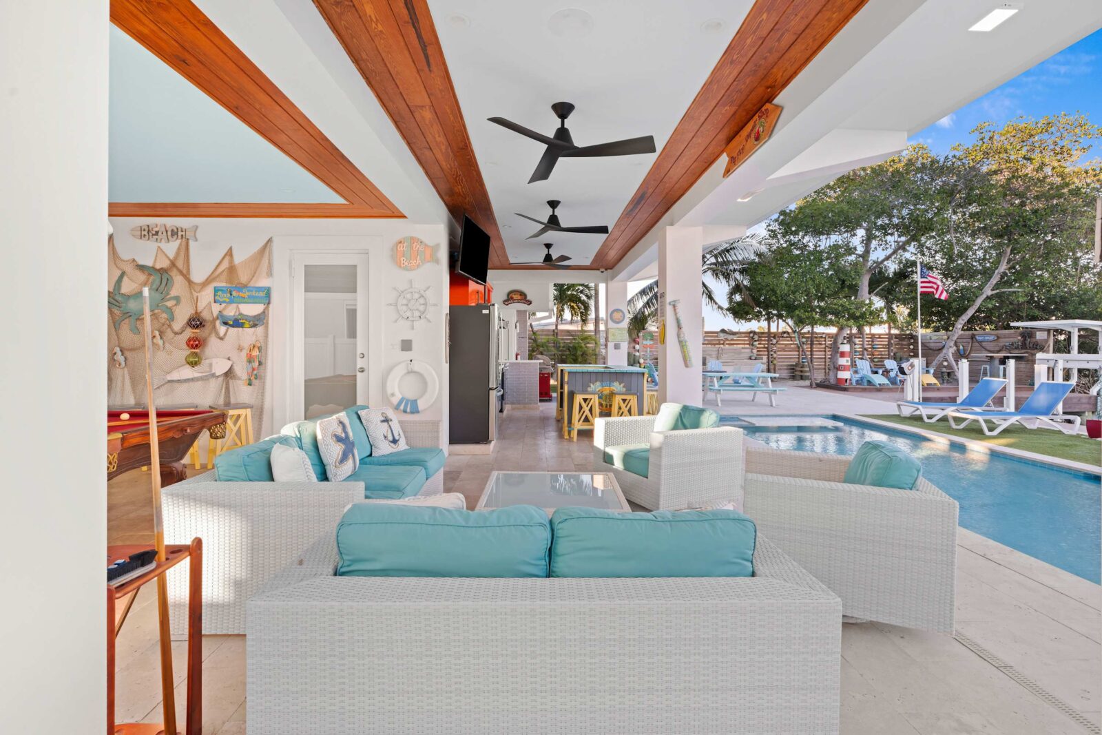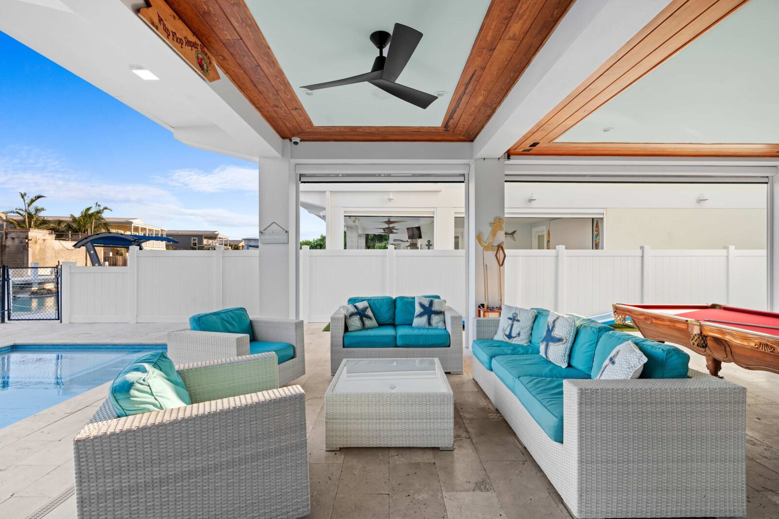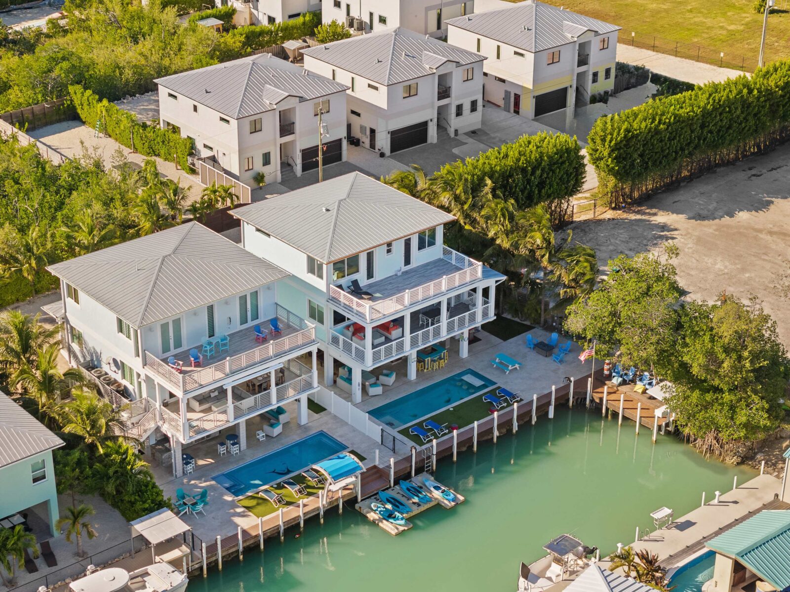 Last but certainly not least is the lavish ground floor with the large swimming pool, ocean access, kitchen and bar, and many games that will entertain you for hours. It has its own dock with 50 feet of space. The heated pool has its own private spa, so you can stay close to home if you wish. Outside security cameras and a separate AC unit on each floor add to the comfort and convenience of this property.